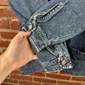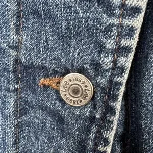 Color/Pattern: Blue denim with brown corduroy collar, contrast stitching, and solid pattern.