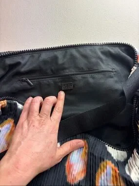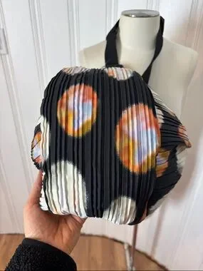 This unique pleated crossbody / shoulder bag features a fluid, sculptural half-moon silhouette that drapes beautifully when worn. The textured accordion-style fabric gives it movement and dimension, while the abstract, painterly multi-color dot pattern (orange, blue, purple, yellow on black) adds a bold, artistic touch.