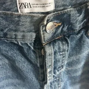 Classic Zara denim shorts. Light blue wash with ripped details. Frayed hem for a lived-in look. Five-pocket style with button fly. Easy summer staple.