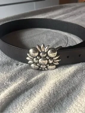 Michael Kors leather belt with a statement floral concho buckle. Polished silver-tone floral hardware. Sleek black strap for versatile styling. Elevates casual and dress looks. In very good condition. I’ve only worn it a couple of times. Genuine leather. Size small.