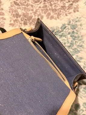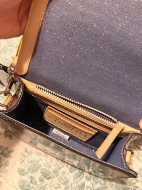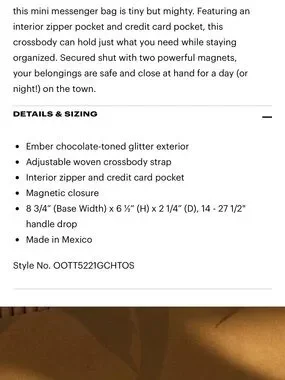 Glitter-finish crossbody in deep chocolate brown. Glitter has a red sheen. Front logo plaque adds brand detail. Removable striped shoulder strap for flexible wear. Compact shape with flap closure. Perfect for day-to-night use. I didn’t look at sizing before I purchased. Added the size description from web site.