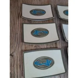 Set of six vintage-inspired sushi or appetizer plates featuring a unique rectangular shape with slightly curved edges. Each plate showcases a speckled cream-colored base with a dark olive green border and a central oval motif. The center design depicts a stylized blue character or wave pattern set against a swirling gray background, reminiscent of mid-century modern or Japanese stoneware aesthetics. These versatile small plates are perfect for serving sushi, tapas, or side dishes, adding a touch of artistic flair to any table setting.