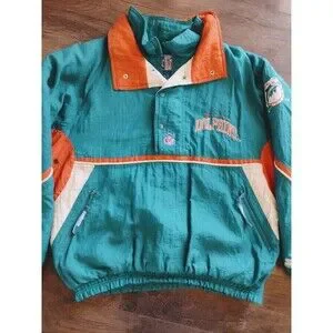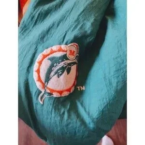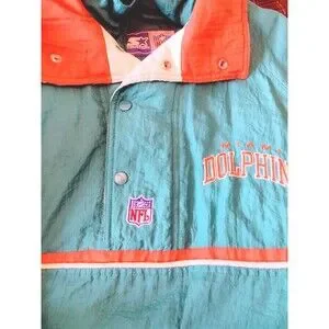 The Vintage NFL 90s Miami Dolphins Jacket is a classic puffy pullover designed by Starter, perfect for men who are fans of the National Football League. This jacket features the iconic Miami Dolphins team colors of blue and is made with high-quality materials. The jacket is in size Large, with a regular fit and is ideal for wearing during the regular season game.