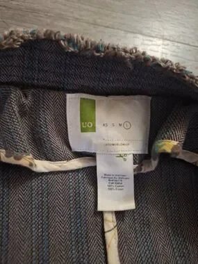 This jacket is an Urban Outfitters 1970 Worldwide Striped Button Up Blazer. It features a distinctive military-inspired design with a cropped silhouette and vintage-style detailing.