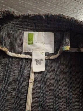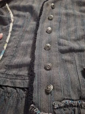 Details: It includes antique-style silver utility buttons, a stand-up distressed collar, and raw, fringed edges for a worn-in look.