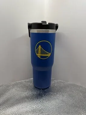 Insulated blue travel tumbler. Yellow Golden State Warriors logo on front. Black lid with handle and flip straw. Sleek matte finish. Great for on-the-go use.