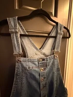 Classic denim overalls with a button-front closure. Adjustable shoulder straps. Front bib pocket and functional side pockets. Relaxed, easy silhouette for casual wear.