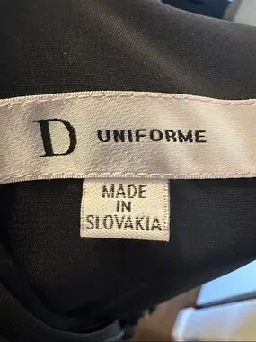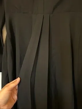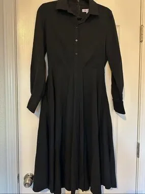 Dior long-sleeve dress with a sharp collar and buttoned front. Fitted waist leading to a pleated, flowing skirt. Timeless black silhouette suitable for day or evening.