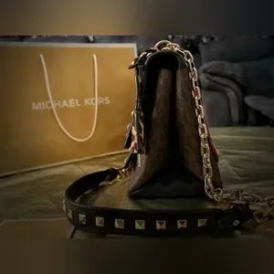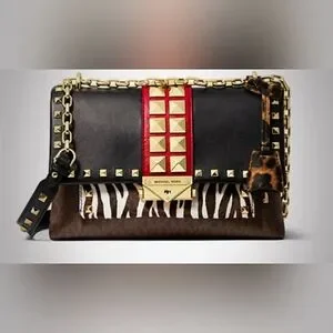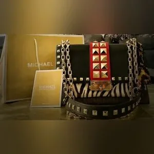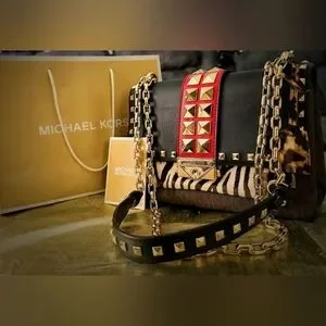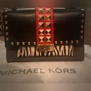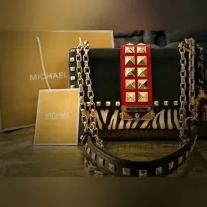 Stylish Michael Kors shoulder bag with bold red and black design. Features striking studded accents and chain strap. Perfect for any occasion.