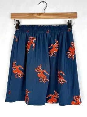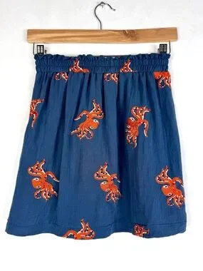 Fun navy blue skirt featuring orange embroidered octopus motifs and an elasticated waistband.