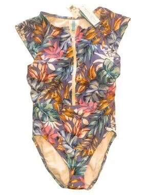 NWT Beach Betty Blue Tropical Floral One Piece Front Zip Slimming Swimsuit SMALL