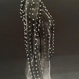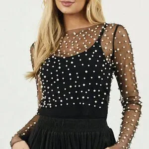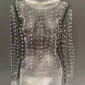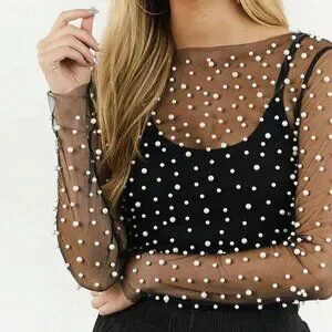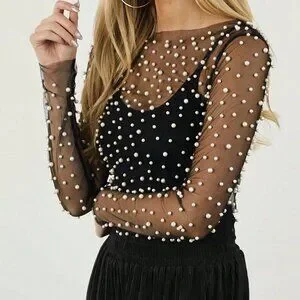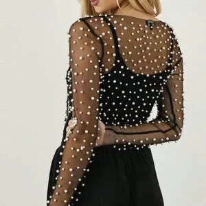 Black Casual Women's Rave Elegant Pearls Beaded Mesh Sheer Cover Up