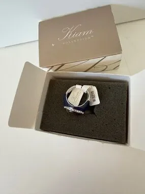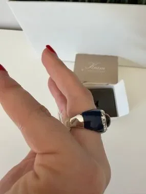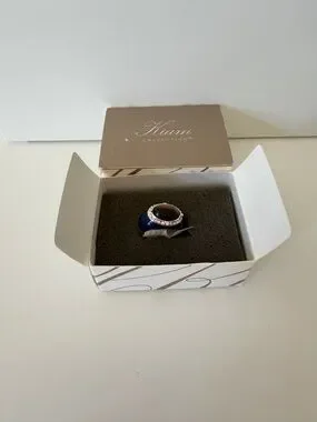 Bold oval tiger's eye center stone. Surrounded by a sparkling rhinestone halo. Dark oval band frames the design. Striking and wearable statement piece.
