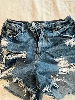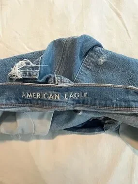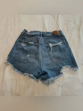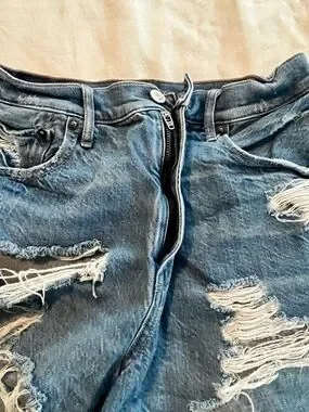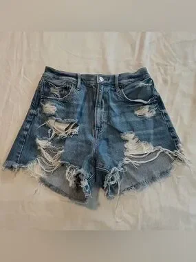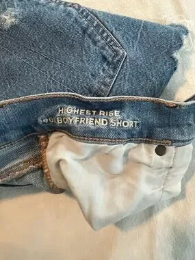 American Eagle Outfitters women's denim shorts with heavy distressing and frayed hems. Light blue wash with multiple ripped details. Highest rise boyfriend shorts. Classic five-pocket styling and button fly. Casual, edgy look easy to style. EUC