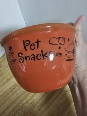 Hallmark "Pet Snacks" bowl. This sturdy ceramic stoneware piece features a vibrant orange exterior decorated with charming black sketch-style illustrations of various dogs, bones, and paw prints.