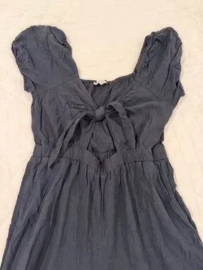 Lightweight black jumpsuit from American Eagle Outfitters. Wide-leg silhouette with gathered waist. Short puff sleeves and a front tie detail. Flowy, breezy fabric for casual wear.