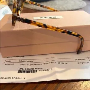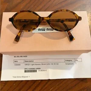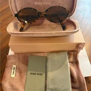 Reposting these Miu Miu oval sunglasses in tortoiseshell acetate that I just purchased. Sadly these are too small for me. Brown tinted round lenses. Includes all the branded accessories…pink velvet case, velvet bag, lense wipe and box. Sunglasses are in Brand New condition.