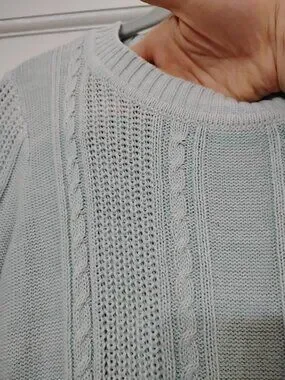 Get cozy and stylish with this playful twist on the classic cable knit sweater! Made of a cotton and acrylic blend, this soft, comfy sweater is perfect for pairing with jeans or a jean skirt and boots.