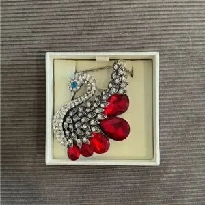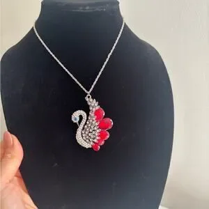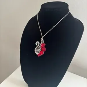 Elegant silver-tone swan pendant necklace featuring red crystal teardrop accents and clear rhinestones. Sparkling blue eye detail adds refined contrast. A versatile women’s jewelry piece that adds a touch of glamour to any outfit.