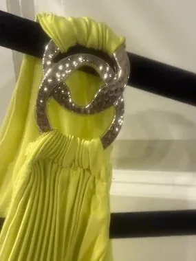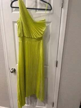 Stunning White House Black Market lime/chartreuse pleated dress with a chic one-shoulder neckline and statement ring detail Flowy, flattering, and perfect for weddings, vacations, or summer events.