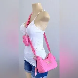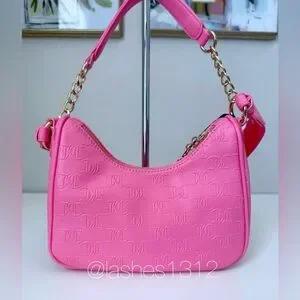 Stylish pink handbag with matching pouch. Features Juicy Couture logo and pom-pom charm.