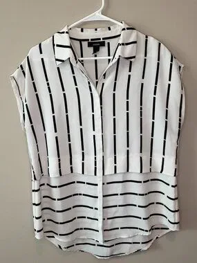 Alfani Button Up Short Sleeved Flowy Blouse in black and white, size 8.
