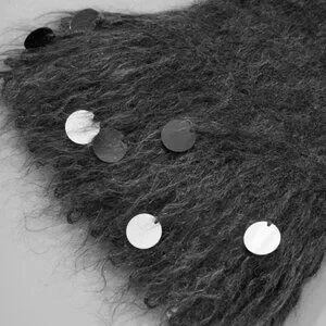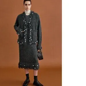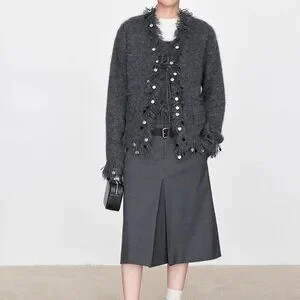 The cardigan features an exclusive circle tassel needle technique, adorning its edges with precise and elegant embellishments, resulting in a plush, multidimensional texture that exudes cozy warmth. Delicately hand-sewn sequins further elevate its allure, creating shimmering accents that enhance its ethereal beauty. The interplay of light and shadow, combined with the fluid movement of the tassels, adds a captivating contrast, infusing an aura of elegance to any ensemble.