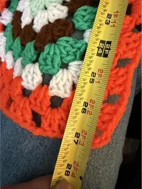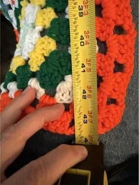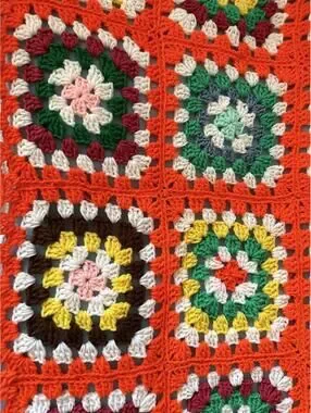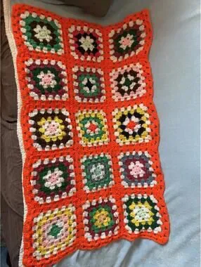 The cutest vintage throw, perfect for adding a delightful pop of color to any nursery, child’s bedroom or otherwise! Afghan is handmade, easy to care for and machine washable. 28”x48”. NOTES: Afghan was lightly used; no stains. It may have the occasional stray thread that needs clipping.