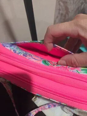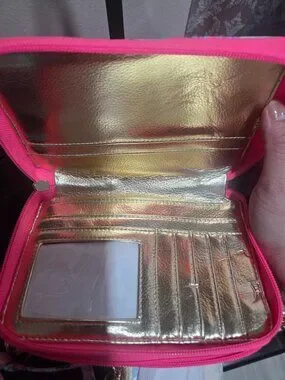 This is a brand new with tags Lilly Pulitzer imitation leather Parks collection, it features mini and Daisy in a castle with pink and colorful flowers the inside has room for multiple cards cash ID there is a removable ID holder as well that you can use for your cards the strap is also removable the sizes are about 5.5 in wide and 3.2 in tall comes with original tags and everything attached was never used