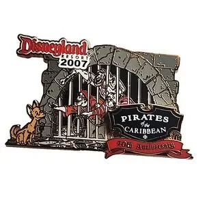 Celebrate the 40th Anniversary of the Pirates of the Caribbean Attraction at Disneyland® Resort with this Limited Edition pin from a Box Set. This set included portraying memorable scenes from the Pirates of the Caribbean Attraction, using Marc Davis' original artwork. This pin features a pin on pin. All featuring the Pirates of the Caribbean 40th Anniversary logo as a pin-on-pin: a gold-bordered black plaque with "Pirates of the Caribbean" in white lettering and a red banner that says, "40th Anniversary." Pin also has the Disneyland® Resort logo.