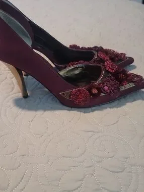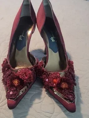 Dramatic burgundy heels with intricate floral appliqués. Sequined and textured embellishments at the toe. Pointed-toe silhouette with a slender stiletto heel. Chic and feminine for special occasions.