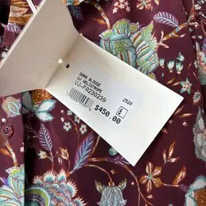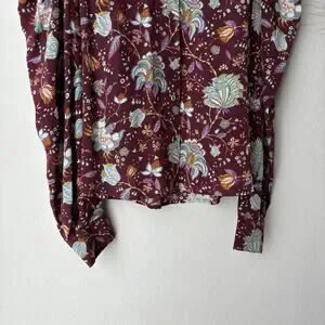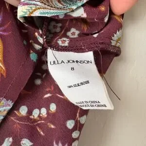Ulla Johnson Dara Blouse in the Heliotrope floral print. Burgundy/ red color. Features ruffled neckline, puff shoulders, and button-front detail. 100% silk. Size 8.