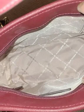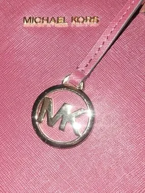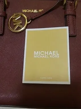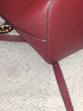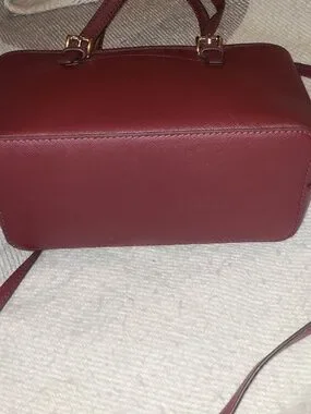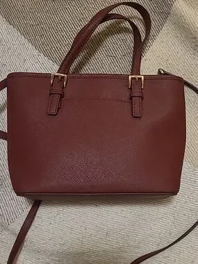 Stylish Michael Kors satchel in deep burgundy. Made from textured Saffiano leather. Gold-tone logo and charm accent the front. Dual top handles plus a detachable crossbody strap. Clean, structured silhouette for everyday use.