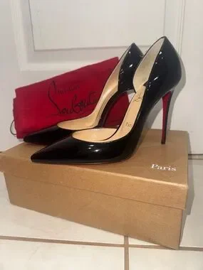 Classic Christian Louboutin pointed-toe pumps in glossy black patent leather. Tall stiletto heel and sleek silhouette. Iconic red sole detail for signature contrast.In excellent condition!!