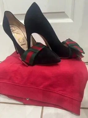 Gucci black suede pumps with a red and green signature bow. Sleek pointed-toe silhouette and high stiletto heel for elegant wear. Iconic Gucci detailing adds luxury to any outfit. Comfortable leather interior for all-day style.Gently used like new!