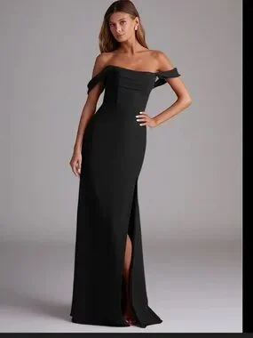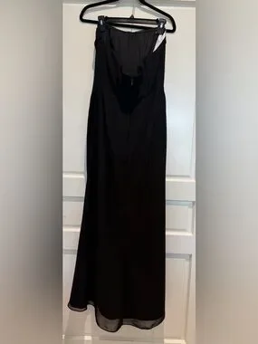 Floor-length black strapless gown. Smooth fitted bodice with flowing skirt. Classic silhouette for formal events. Timeless and versatile.
