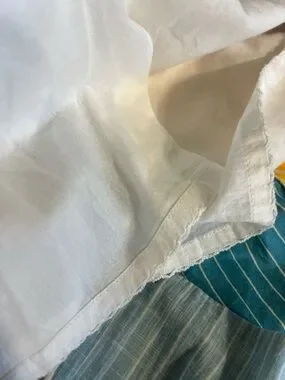 Lightweight cotton skirt with yellow, blue, pink, and white stripes. Elasticized waist for comfort. Casual, airy design for warm weather.