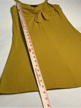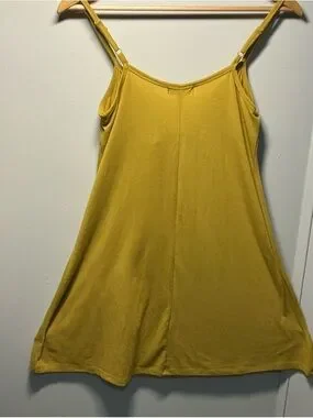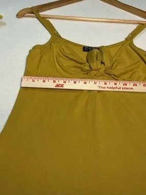 Effortless mini dress with a playful tie-front detail. Slim straps and a soft, lightweight fabric keep you cool and comfortable. Designed in a warm mustard color for easy daytime style. Versatile piece that pairs well with sandals or a woven tote.