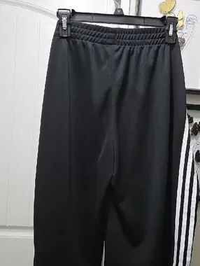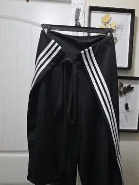 Relaxed wide-leg culotte track pants. Side white triple stripes for a sporty look. Wrap-style waist tie for adjustable fit. Small embroidered trefoil logo at hem. Soft, comfortable fabric ideal for casual wear.