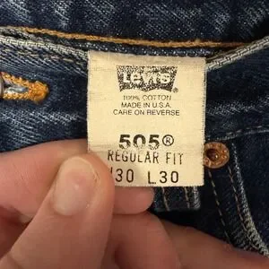 Vintage Levis 505 Regular Fit jeans in a classic medium wash indigo. These 100% cotton denim pants are Made in the USA and feature a straight leg silhouette with a traditional five-pocket design and zip fly. The fabric shows a beautiful natural patina and authentic wear consistent with high-quality vintage denim.