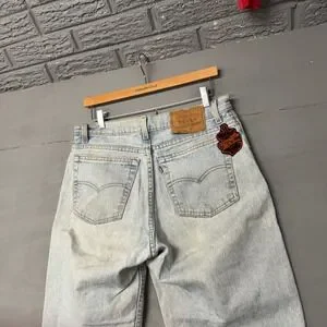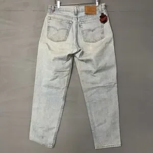Vintage Levi's 550 relaxed fit jeans in a light wash denim feature a classic five-pocket design and a tapered leg silhouette. These 100% cotton jeans were made in the USA and include a unique Harley-Davidson Motor Co. patch on the back right hip for a custom biker aesthetic. The light wash shows natural wear and distressing consistent with vintage denim, providing an authentic lived-in look.