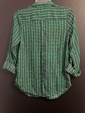 Flowy button-up blouse with a repeating green geometric print on a navy base. Classic collar and long sleeves that can be rolled. Lightweight, easy-to-wear silhouette for day or night.