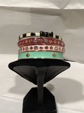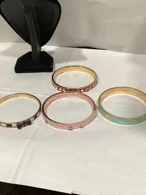 Four kate spade enamel bangles with varied motifs. Includes bow detail, polka dots, studded rhinestones, and small spade accents. Gold-tone trim around each bangle. Stackable, playful color mix. All size 8 except bow one is 7.5