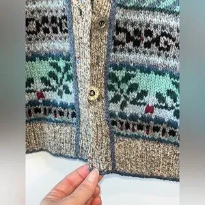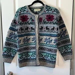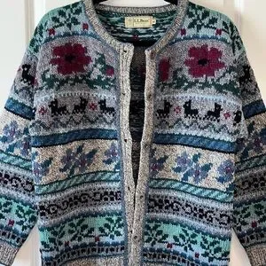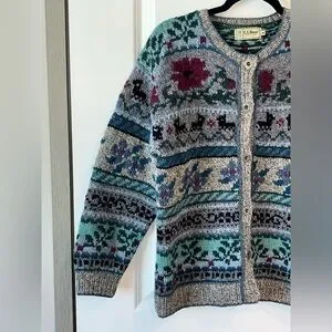 This vintage LL Bean cardigan is a women's medium size made of wool with a tight-knit design featuring an floral and Scottie dog print pattern The cardigan has long sleeves, a crew neck, and button accents, making it a perfect casual piece for the winter, fall, or spring seasons. The blue color and retro 80s, prairie, and hippie themes add a unique touch to this classic cardigan from the brand L.L. Bean. Made in Hong Kong, this cardigan is a stylish addition to any wardrobe for those who appreciate vintage fashion.