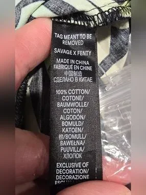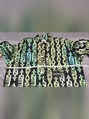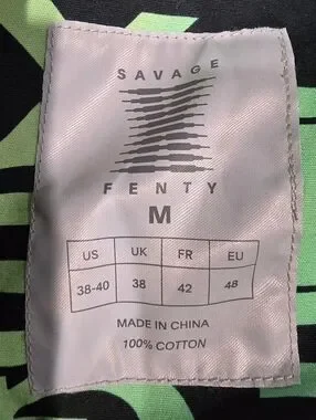 New with tags. Size medium. Oversized fit. Knee length style dress. Curved hem. Button down closure. Logo patch by the hip area. Left chest pocket with logo tag on side. Black background with multi colored fenty savage logo all over. Measurements and fabric content listed above in pictures.