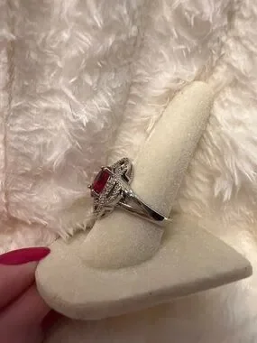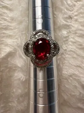 Elegant silver tone ring featuring a vivid red oval center stone. Sparkling halo of clear crystals forms a floral motif. Timeless design that complements evening and everyday looks. Red color adds bold, classic flair.