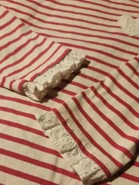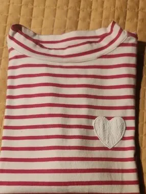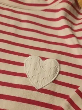 Talbots womens top with pink stripes on a white background. Features a textured heart applique and lace-trim cuffs for charming detail. Soft, breathable fabric designed for daily comfort. Easy to pair with leggings or jeans. Pit to Pit 19"