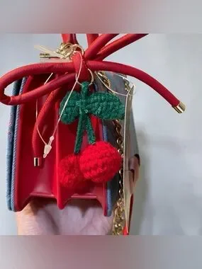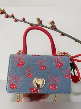 Absolutely adorable and so much fun whimsical cherry bag has cherry crochet charm on the side denim LUV Betsey is the higher end of Betsy Johnson