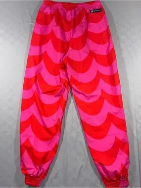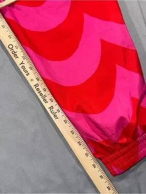 Color and pattern: Bright pink and red geometric scallop print covering the entire pant.