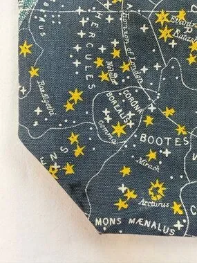 Canvas tote with constellation map print. Navy background with yellow star accents. Natural canvas shoulder straps. Simple, stylish astronomical design.